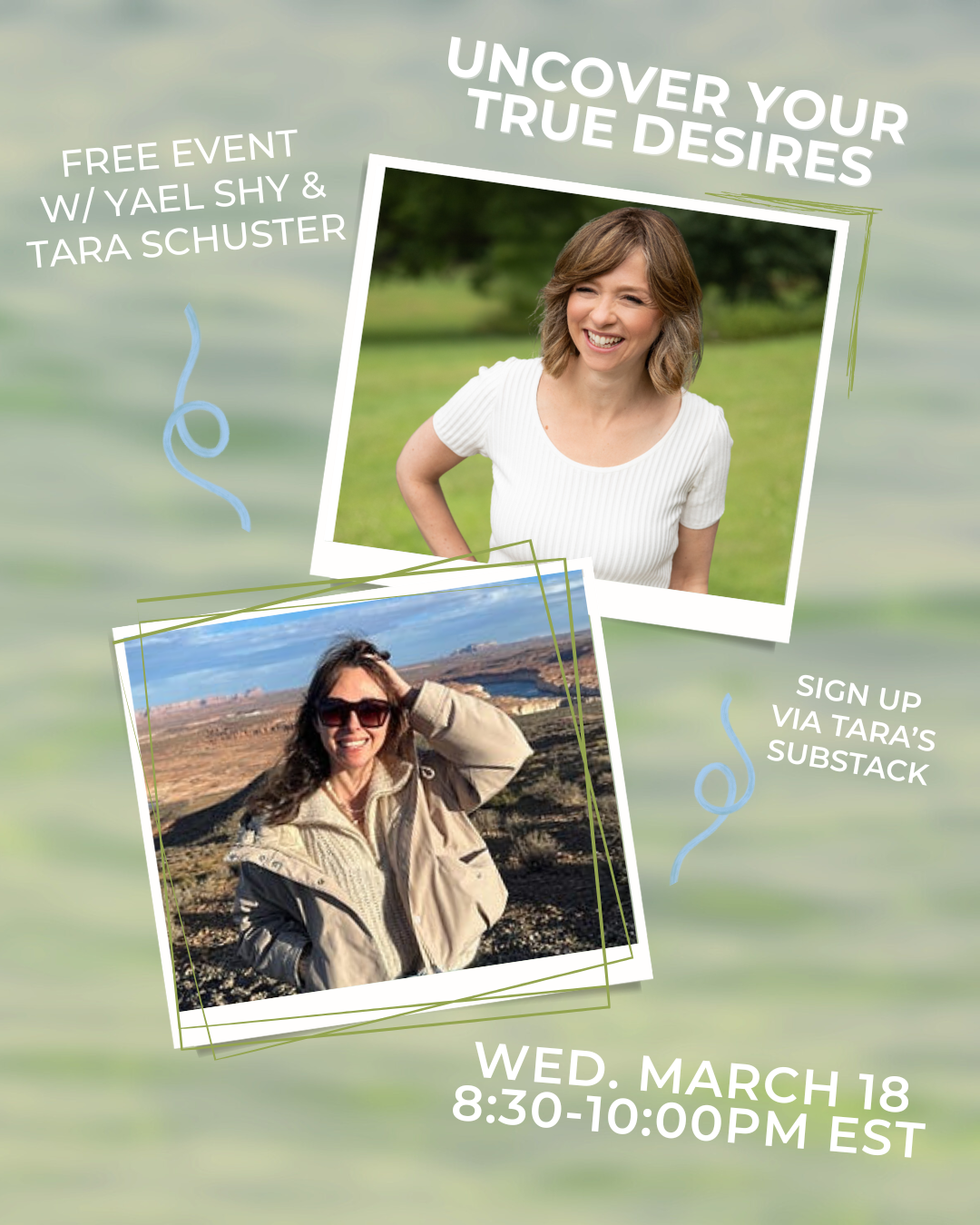 Join myself and Tara Schuster for a free workshop on Wednesday, March 18 from 8:30pm-10:00pm EST! In this engaging session, we’ll explore how to navigate the question, “What do you do if you don't even know what you want?” Additionally, you’ll learn to distinguish between desires driven by scarcity and anxiety versus those inspired by joy and delight.